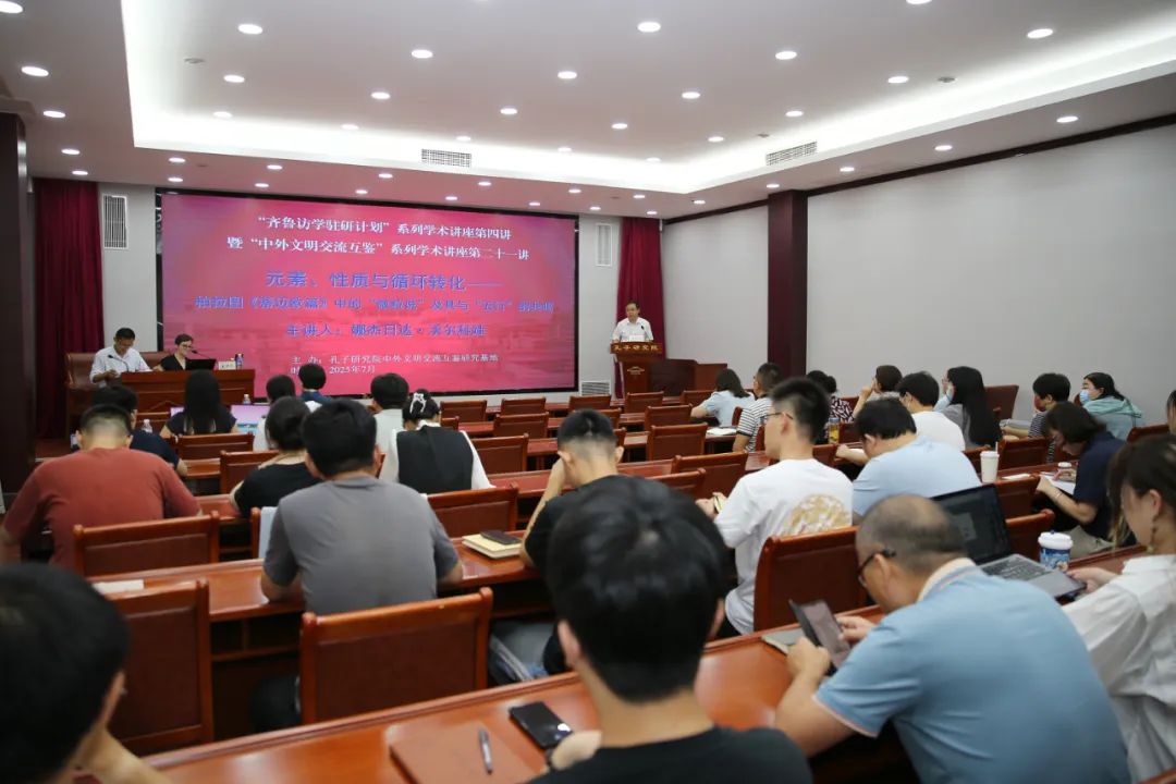 7月22日,孔子研究院“齐鲁访学驻研计划”系列学术讲座第四讲暨“中外文明交流互鉴”系列学术讲座第二十一讲在学术讲堂举行。孔子研究院2025年度“齐鲁访学驻研计划”访问学者,俄罗斯科学院哲学研究所古代哲学系主任、高级研究员、哲学博士娜杰日达·沃尔科娃(Nadezhda Volkova)以“元素、性质与循环转化:柏拉图《蒂迈欧篇》中的‘微粒说’及其与‘五行’的共鸣”为题开讲。孔子研究院副院长魏衍华研究员主持讲座,“齐鲁访学驻研计划”访问学者李善庆、李诗然以及孔子研究院全体科研人员参加。