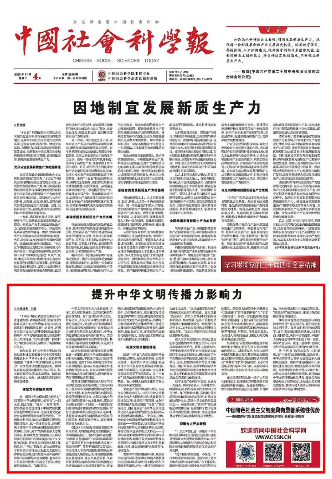 “十五五”时期,进一步提升中华文明传播力影响力,需要社会各界,特别是哲学社会科学界发挥独特优势,深化理论研究,为构建与中国综合国力和国际地位相匹配的国际话语体系提供学理支撑。