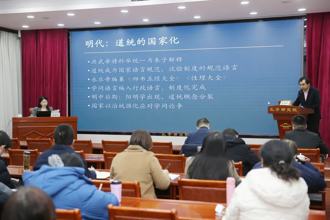 12月29日,“齐鲁访学驻研计划”系列学术讲座第九讲暨“中外文明交流互鉴”系列学术讲座第二十六讲在孔子研究院举行。2025年度齐鲁访学驻研计划(孔子研究院)访问学者、韩国成均馆大学东亚学术院博士后研究员李诗然主讲“以道统确保为基础的治统正当化之政治策略——清康熙之宣告与朝鲜正祖之归摄”。孔子研究院党委委员、副院长魏衍华出席讲座,科研管理部部长、副研究员房伟主持讲座。孔子研究院全体科研人员参加。