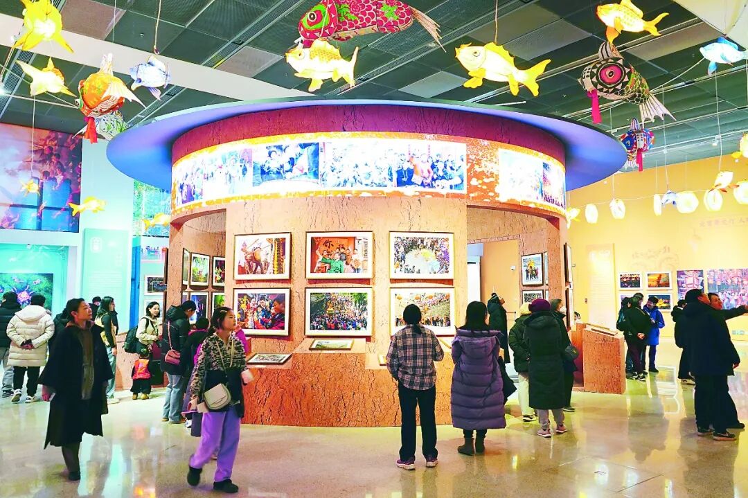 中国式现代化既要物质财富极大丰富,也要精神财富极大丰富、在思想文化上自信自强。 图为观众在中国非物质文化遗产馆内参观 “过年——春节主题摄影展”。透过画面,观众能看到非物质文化遗产在当代的活态传承,感受春节文化中“天人合一”“和合共生”的古老智慧。 图片来源:视觉中国