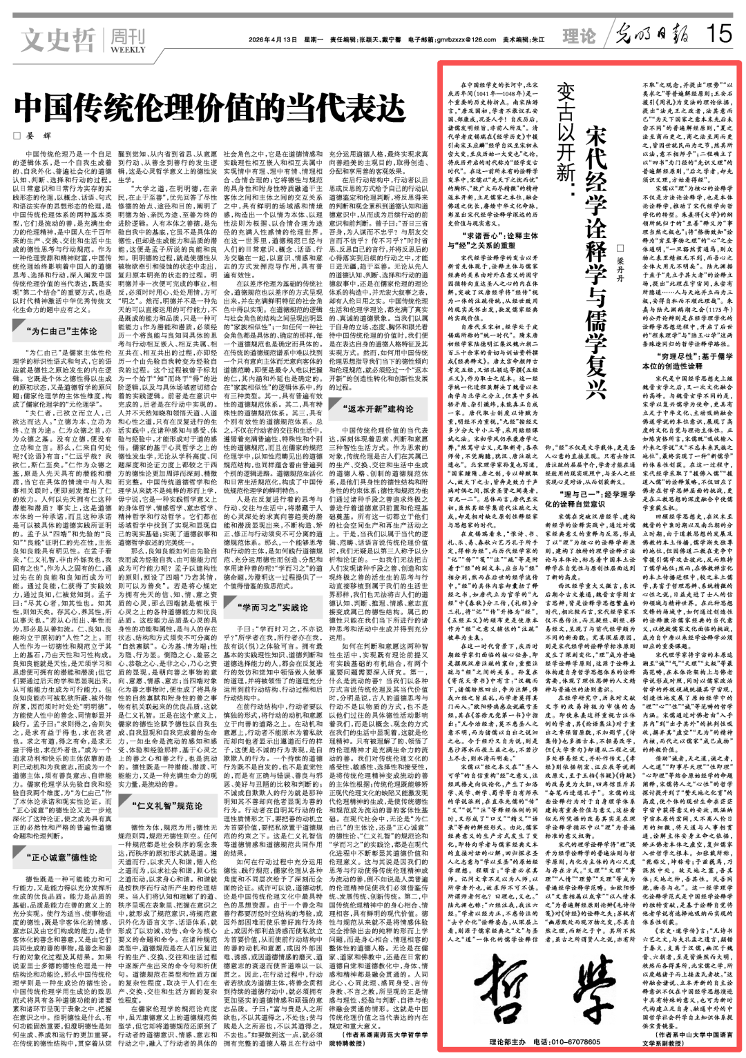 《宋史·道学传》言:“凡诗书六艺之文,与夫孔孟之遗言,颠错于秦火,支离于汉儒,幽沉于魏晋、六朝者,至是皆焕然而大明,秩然而各得其所,此宋儒之学,所以度越诸子而上接孟氏者欤。”这种融会诸说、立本开新的自主诠释意识不仅在中国经学思想演进中具有特殊的意义,也可为新时代构建立足自身、融通中外的中国哲学社会科学自主知识体系提供宝贵镜鉴。