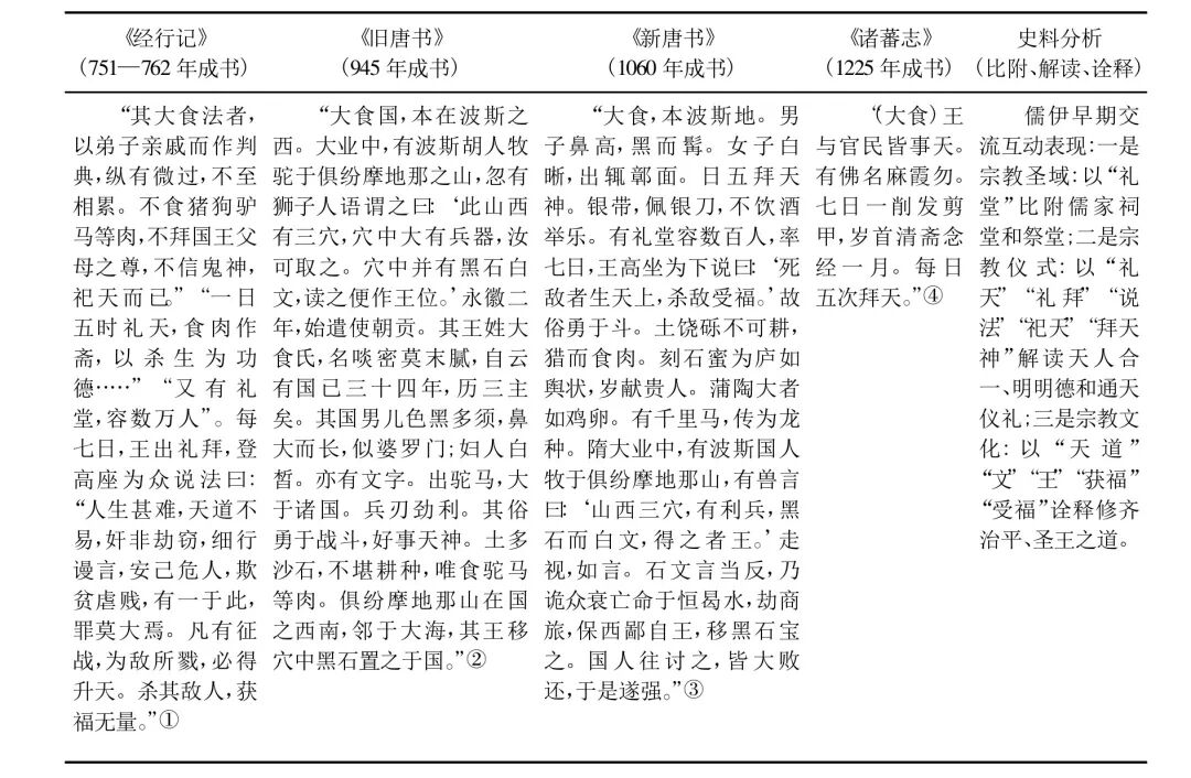 公元7世纪伊斯兰教诞生于阿拉伯半岛,不久即通过海路和陆路传入中国。唐宋时期中国人对伊斯兰教已经有了初步的了解、交流和互动;其相互介绍认识还只局限于表层仪规,常常与儒家的祭祀、道教与佛教的宗教礼仪联系起来;相关著述主要文体为见闻游记、随时札记、年谱或大事记;多有比附、解读、诠释,表现为善意的牵强附会、考据辞章,少有深邃的义理探究和核心理念探析。儒伊早期交流互动如表1所示。